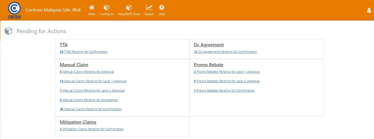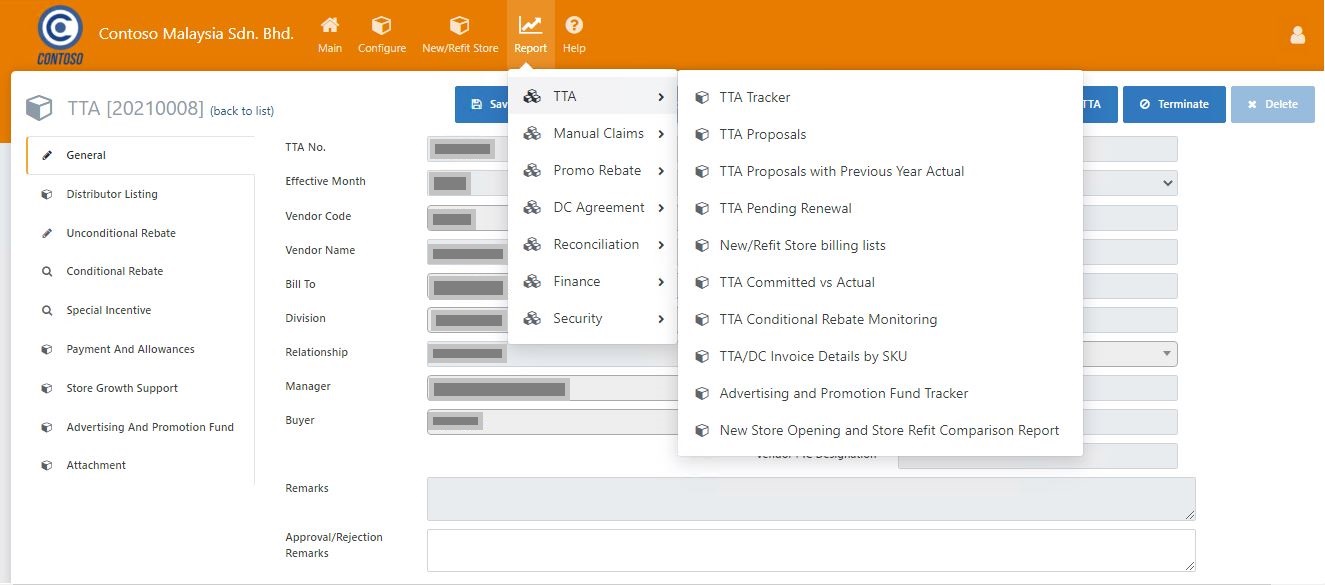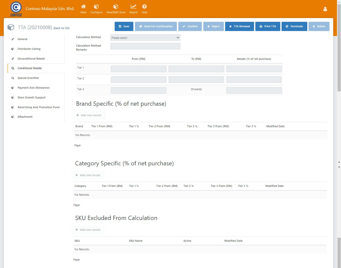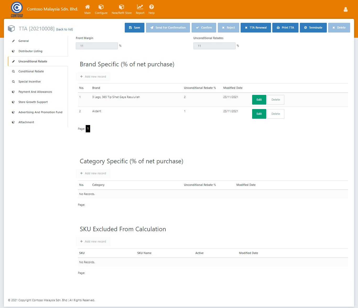 Rebate Management System allows the Admin and Buyers to maintain the Trading Term Agreement (TTA), Manual Claim, Promo Rebate Agreement and CDC Agreement details, printing it out as a physical contract for the suppliers to sign and acknowledge and getting it confirmed.